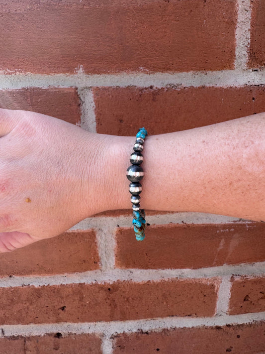 Handcrafted Kingman Turquoise & Sterling Silver Pearl 5-10mm Beaded Bracelet 8"