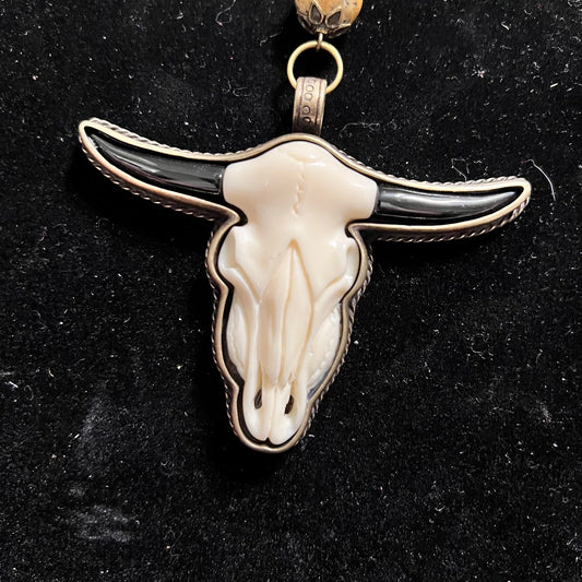 Tibetan Hand Carved Bone Steer Head Pendant Necklace 0735