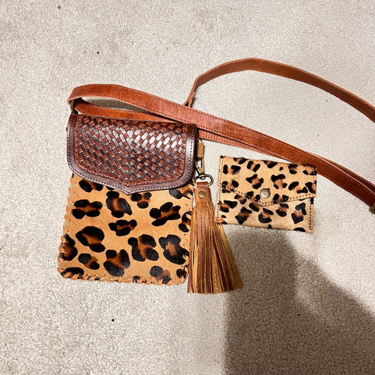 Cowhide and Tooled Leather Leopard Crossbody with Key Chain Wallet 1970