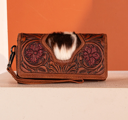 Trinity Ranch Genuine Hair-On Cowhide Tooled Fringe Crossbody Bag with Wallet - BROWN (No 714) 2064