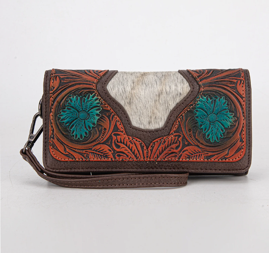 Trinity Ranch Genuine Hair-On Cowhide Tooled Fringe Crossbody Bag with Wallet - COFFEE (No 711) 2065