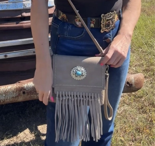 Genuine Leather Fringe Crossbody with Silver and Turquoise Concho Handbag 1960