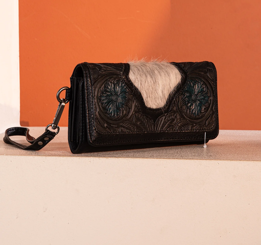 Trinity Ranch Genuine Hair-On Cowhide Tooled Fringe Crossbody Bag with Wallet (No 710) 2070