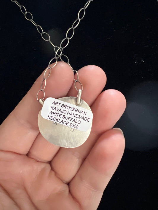 Genuine Navajo Handmade Sterling Silver White Buffalo Pendant Necklace Artist Art Brogerman
