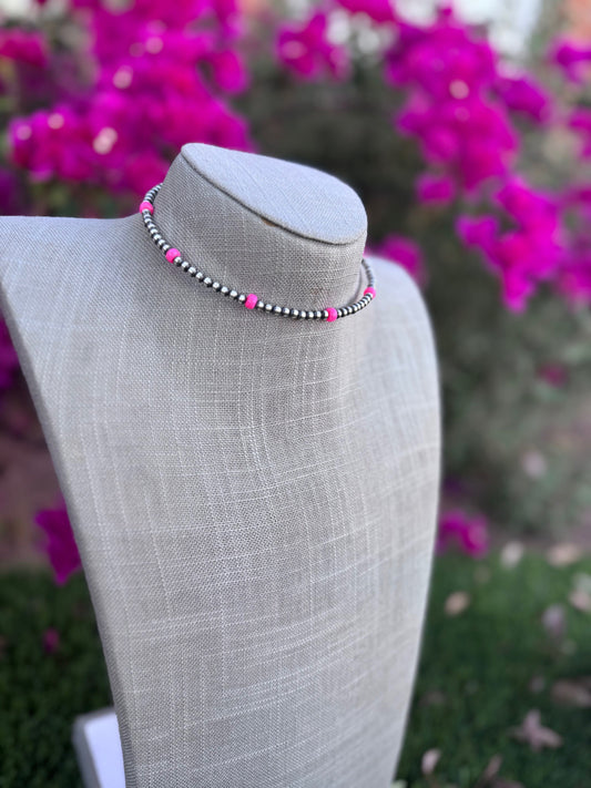 Handcrafted Hot Pink Fire Opal & Sterling Silver 4mm Beaded Wrap Choker Necklace
