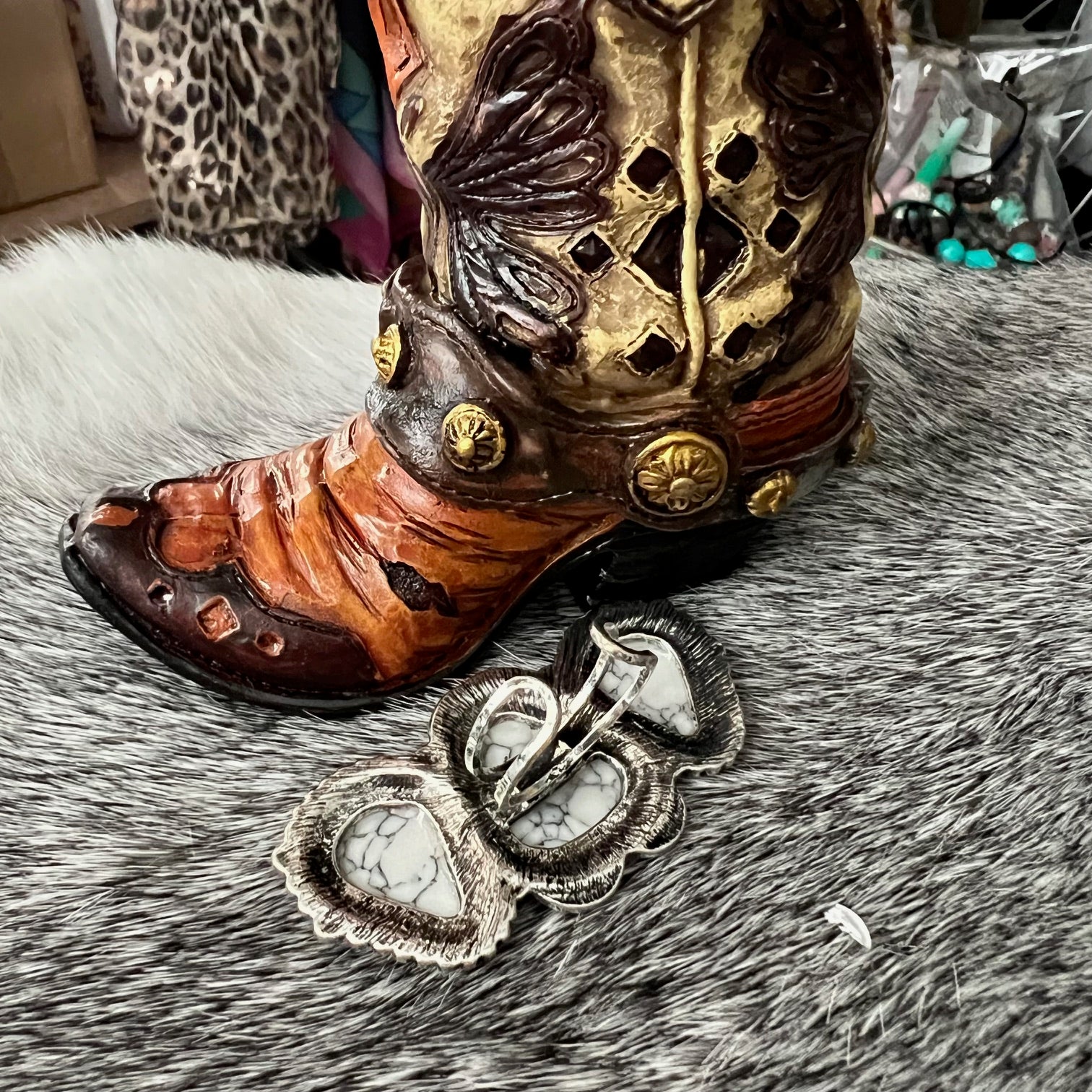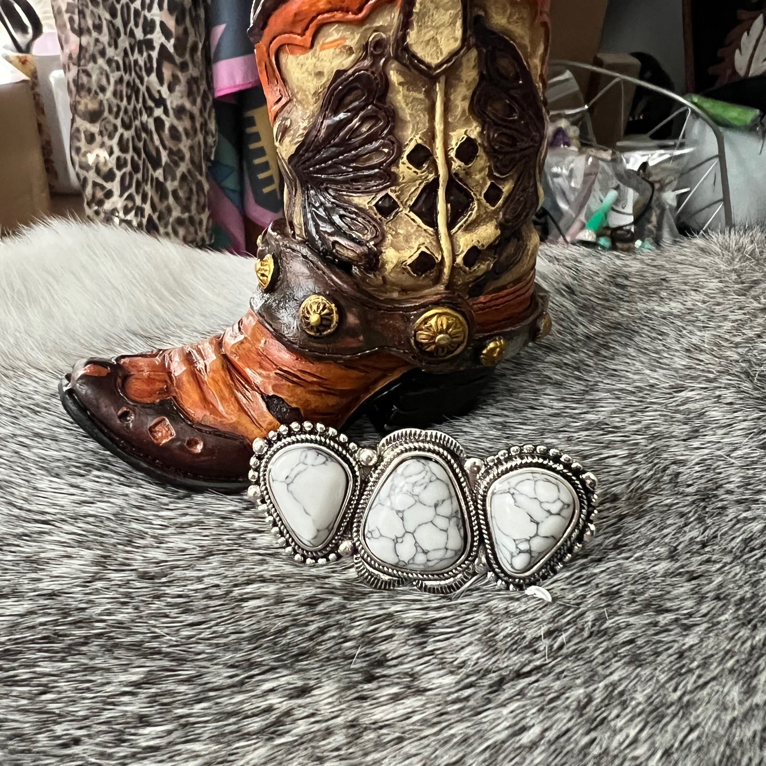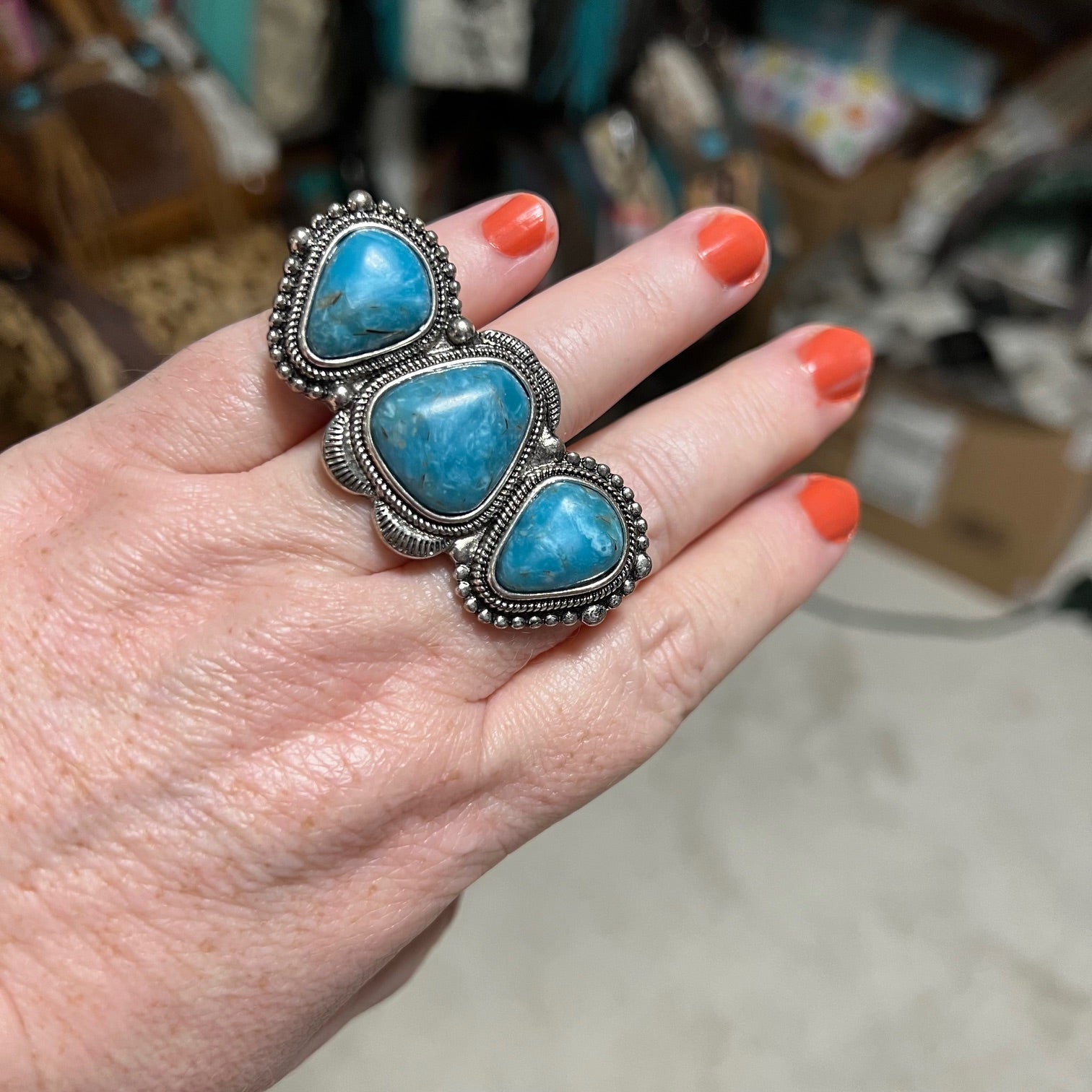 Take your style to the next level with our 3 Stone Turquoise Cuff Ring! The unique design features three stunning turquoise stones, adding a pop of color and sophistication to any outfit. Elevate your fashion game and make a statement with this must-have accessory!