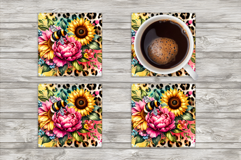Protect your furniture in style with our Bees and Sunflower Square Neoprene Coasters - Set of 4! These coasters feature beautiful designs of bees and sunflowers, adding a touch of nature to your home decor. Made of durable neoprene material, these coasters also provide a non-slip surface to keep your drinks in place. A perfect addition to any gathering or a great gift for any nature-lover.