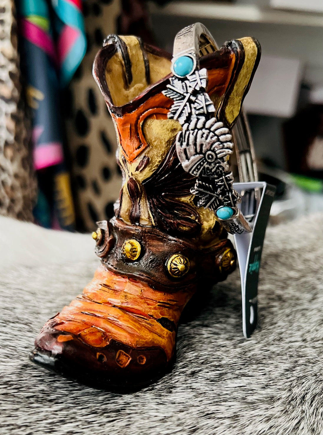 This stretch bracelet features an intricate Indian head design and striking faux turquoise stones. Elevate your style with this stunning piece, perfect for adding a touch of bohemian flair to any outfit. Let the vibrant colors and detailed design transport you to a world of beauty and culture.
